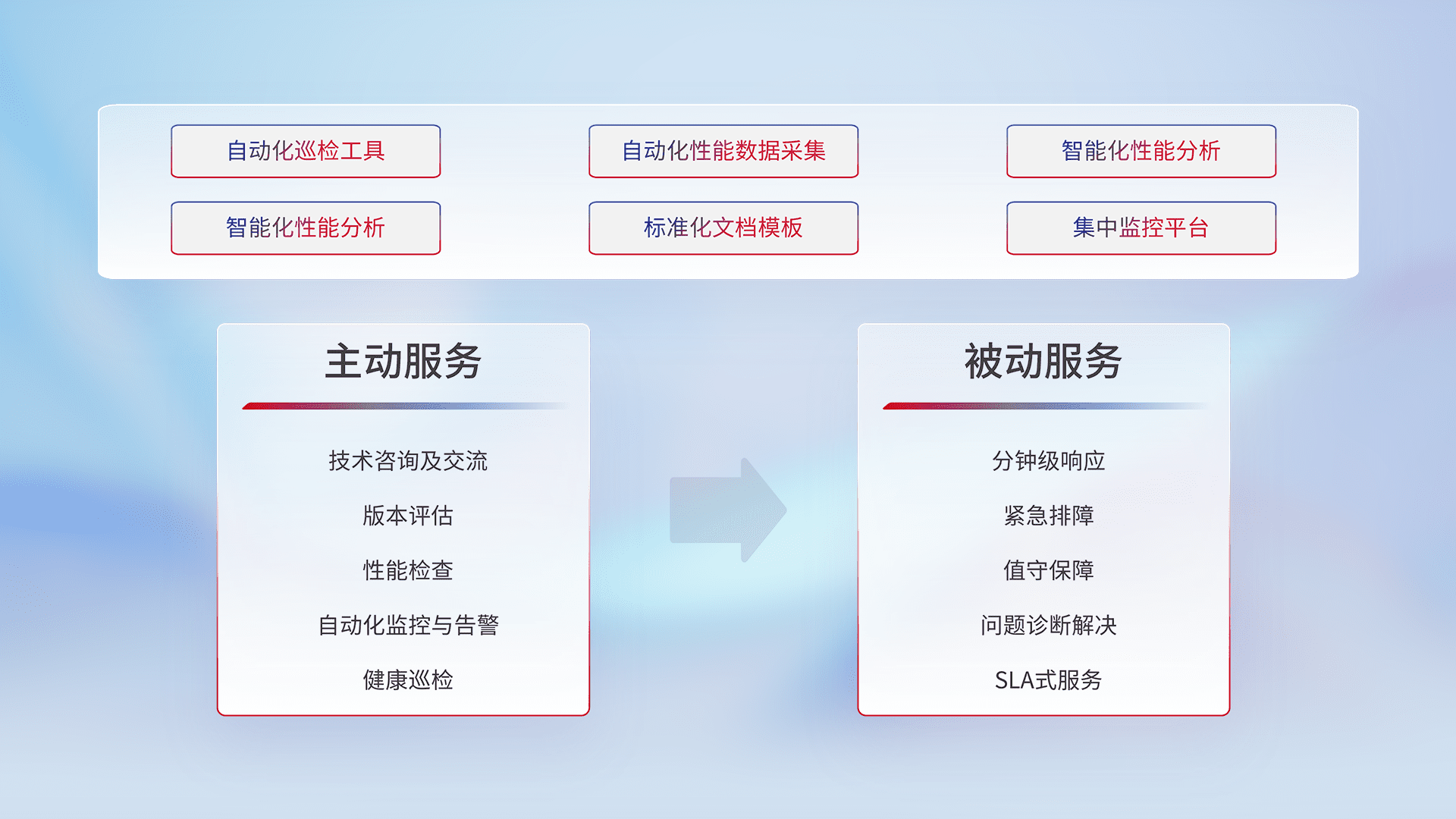 智能化工具和标准化文档,,保障服务质量,,,提供主动服务(包含技术咨询、、、版本评估、、、性能检查、、、、自动化监控与告警、、健康巡检)和被动服务包含(分钟级响应、、、紧急排障、、、值守保障、、、问题诊断解决、、、SLA服务)。。